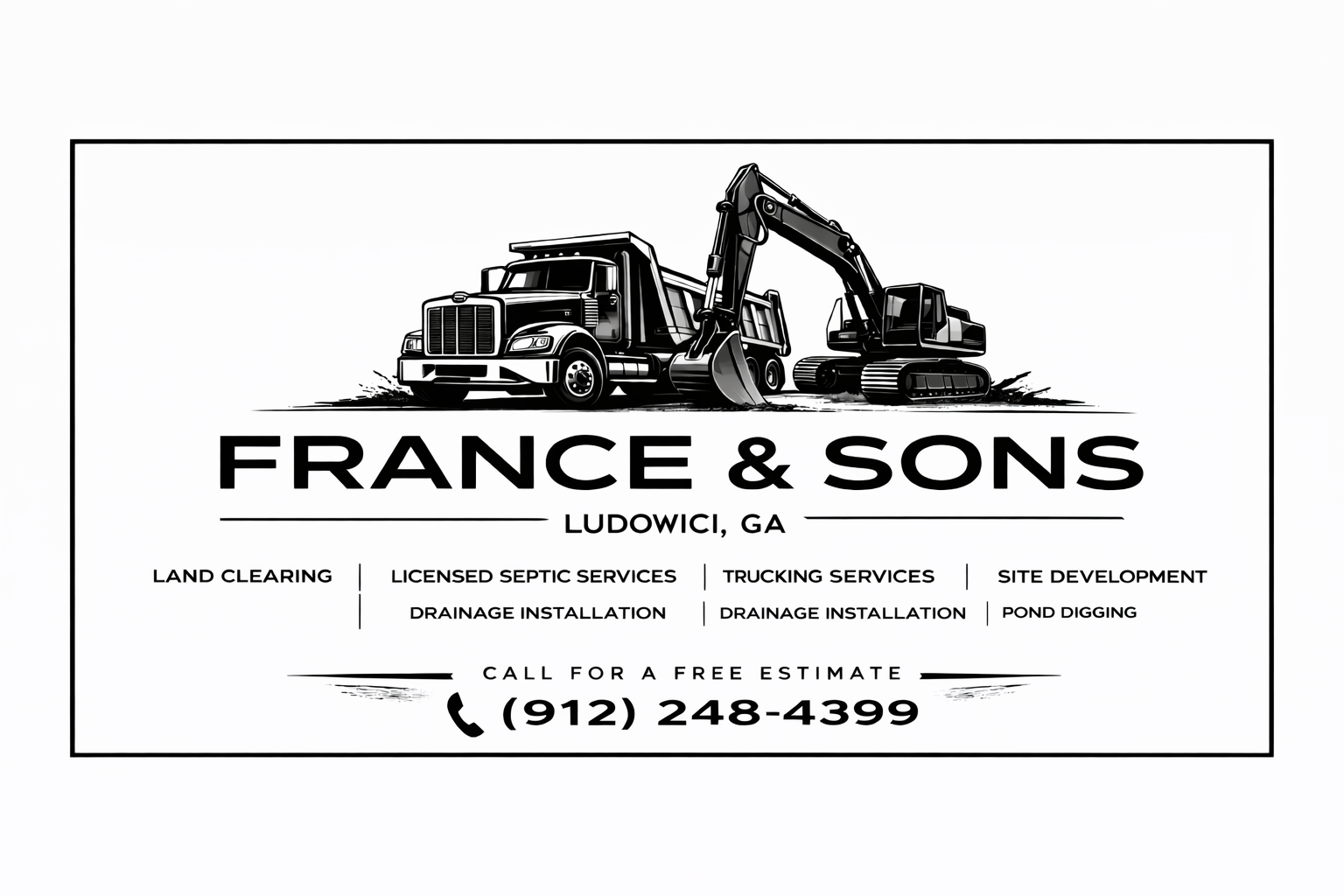 France & Sons is a locally owned, dual-veteran family business providing comprehensive property development services. We specialize in land clearing, excavation, septic installation and service, material hauling, pond construction, and site preparation. Fully licensed and insured, we deliver reliable workmanship and professional service on every project.